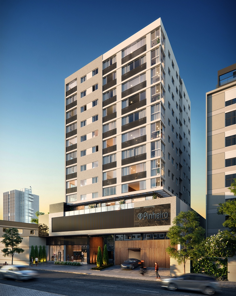 Alto Padrão de construção, com 12 andares, fachada 100% revestida em plaquetas, esquadrias externas em PVC e internas em WPC, luz de presença nas áreas comuns, antena de TV coletiva, coleta seletiva de lixo, espera para ar condicionado split, medidores individuais de água e gás, porteiro eletrônico, 2 elevadores, salão de festas, espaço kids. As unidades de 1, 2 e 3 dormitórios, do Pinheiro living + design têm de 66, 90m² a 152, 66m², com churrasqueira em todas as unidades, ótima iluminação e ventilação natural.