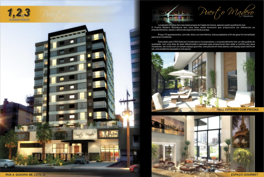 Lançamento de um novo empreendimento de alto luxo na praia de Capão da Canoa, localizado de frente para uma linda praça de lazer onde você poderá passar os melhores dias com sua família. Edifício com 12 andares, hall de entrada com pé direito duplo, 100% revestido em pastilhas, hidrômetros individuais, sistema de água quente, gás central, esquadrias em alumínio anodizado, junto ao pavimento térreo um excelente salão de festas e piscina, zelador permanente. Localizado a poucos metros da beira mar. O Puerto Madero terá uma condição de pagamento especial, para que você possa adquirir um imóvel de altíssimo padrão e em uma localização nobre. Entrada de 30% e saldo em até 50x direto com a construtora. Ligue e solicite mais informações.