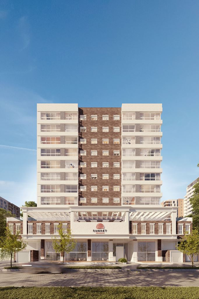 Alto Padrão de construção, com 12 andares, fachada 100% revestida em plaquetas, esquadrias externas em PVC e internas em WPC, luz de presença nas áreas comuns, antena de TV coletiva, coleta seletiva de lixo, espera para ar condicionado split, medidores individuais de água e gás, porteiro eletrônico, 2 elevadores, academia, espaço gourmet, salão de festas, deck externo, bicicletário, 3 pavimentos de garagens + mezanino de estacionamento. Os amplos apartamentos de 1, 2 e 3 dormitórios, do Sunset Residence têm de 57m² a 148m², com churrasqueira em todas as unidades, ótima iluminação e ventilação natural.