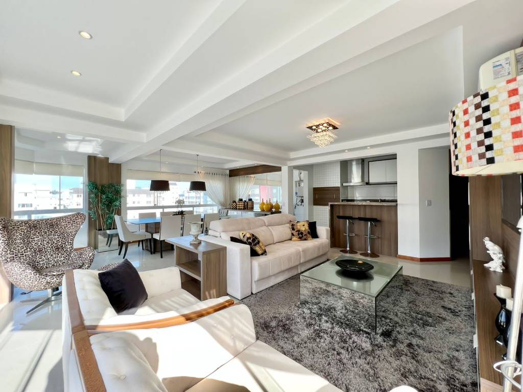 Localização nobre, de esquina em frente à praça, apenas 1 quadra do mar. Lindo apartamento finamente mobiliado e decorado, distribuído em 3 amplos dormitórios, sendo um suíte, banheiro social, lavanderia separada, cozinha americana com bancada em granito, living em 3 ótimos ambientes integrados a uma ampla sacada em L de frente e toda fechada em vidro temperado com vista definida para o mar, praça e serra, churrasqueira com exaustor, apartamento novo, andar alto, peças muito amplas e bem distribuídas, excelente acabamento, piso em porcelanato, sanca em gesso, 2 garagens para carro. Edifício novo de esquina, classe AAA, 12 andares, portão e porteiro eletrônicos, 100% revestido em plaquetas, hall de entrada decorado, água quente, ar Split instalados, gás central, hidrômetro individual de água, 2 elevadores digitais, zelador permanente, salão de festas. Condições de pagamento facilitadas, estuda imóvel de menor valor e parcelamento sem juros.